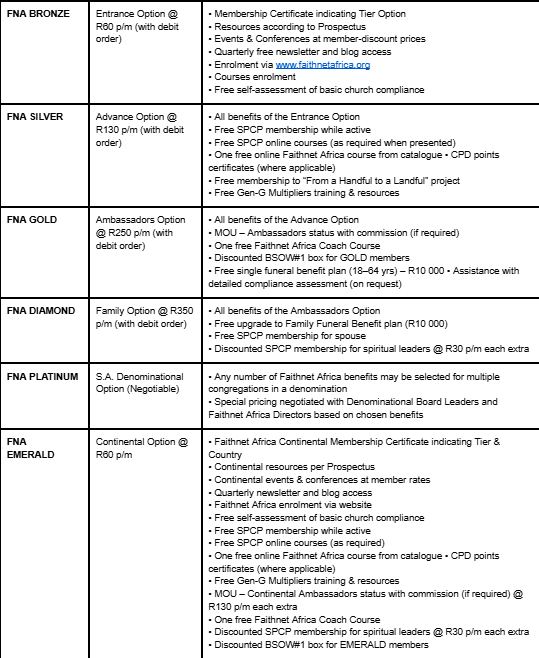 Faithnet Africa NPC offers access to SPCP membership as part of its structured tier plans. Each tier builds greater value, connection, and opportunity.